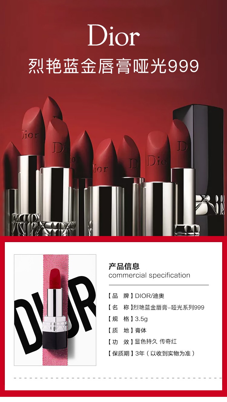 迪奥(Dior)烈艳蓝金唇膏-哑光999# 3.5g 传奇红(口红 雾面质地 显色正红色 李佳琦推荐)
